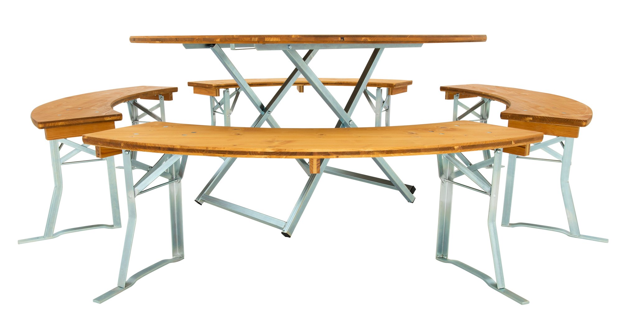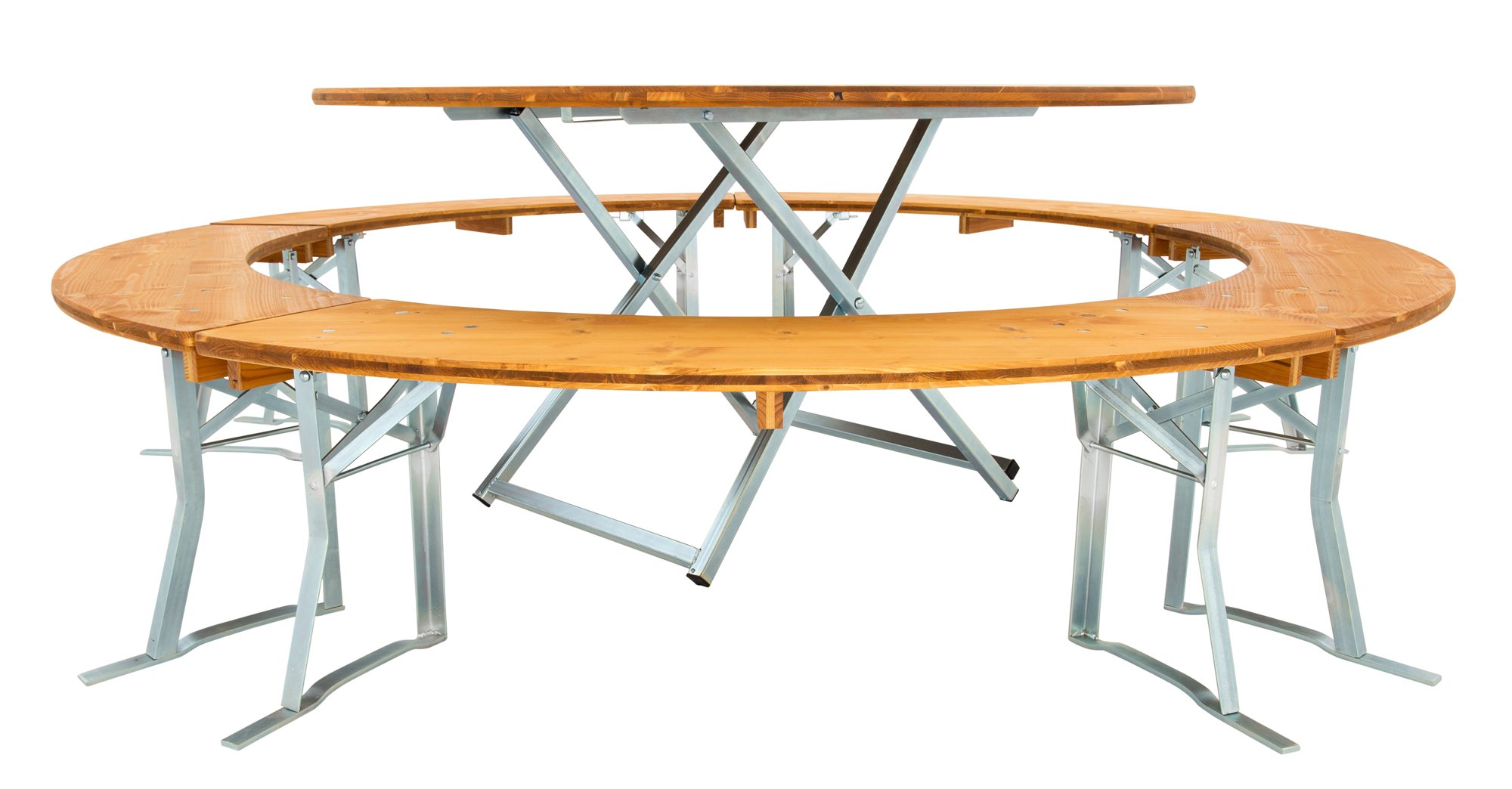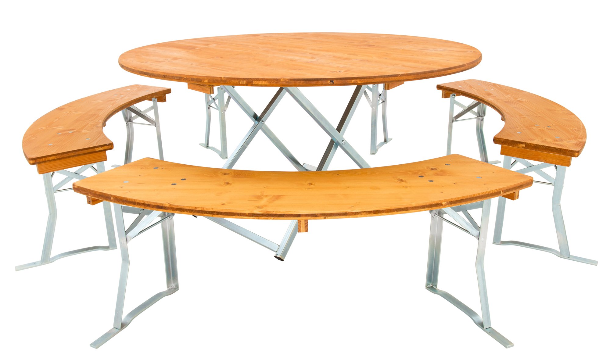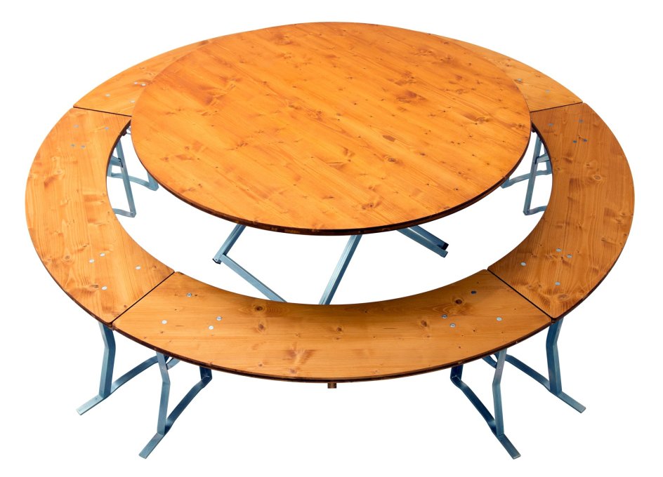 Waar andere fabrikanten stoppen beginnen onze biertentensets pas echt. Dankzij onze drielagige houten planken kunnen wij ze in elke maat en in uitstekende kwaliteit produceren. Elke bank kan door maximaal drie personen worden bezet. Afhankelijk van de opstelling met vier of vijf banksegmenten wordt een zitcapaciteit van 12 tot 15 personen gecreëerd. De ronde set nr.146 heeft een ronde tafel met een diameter van 150 cm, een gegalvaniseerd tafelframe en drielagige houten platen van vurenhout, geglazuurd in de kleur teak.