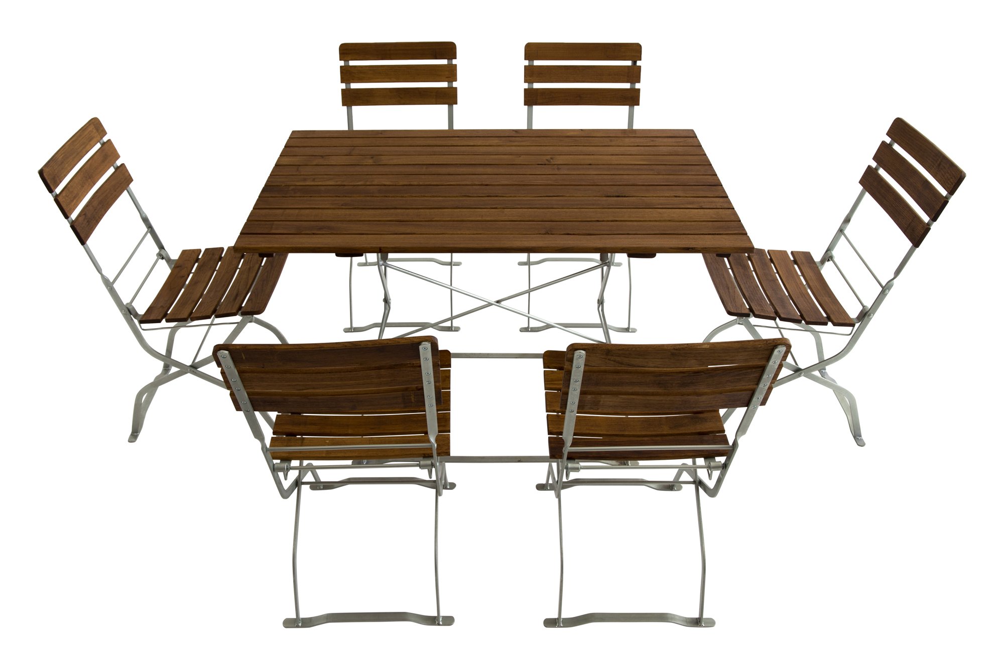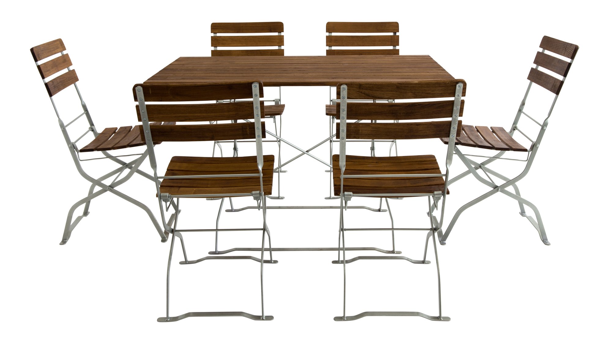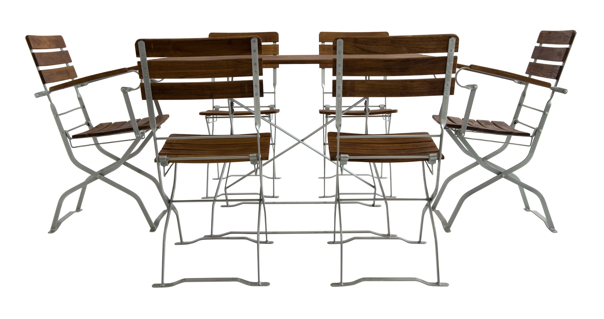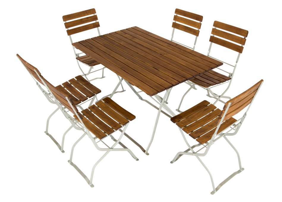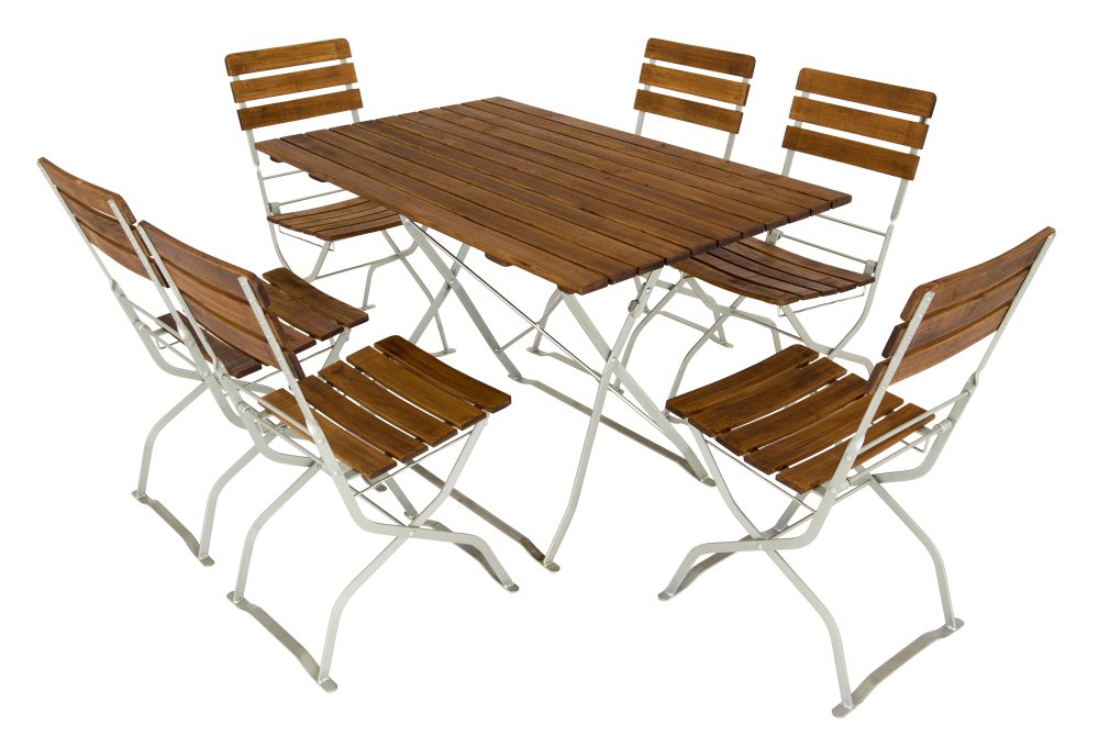 Zitgroep met rechthoekige tafel, inklapbare biertuinstoelen zonder armleuningen met drie gebogen rugleuningen en zitrails van robinia zonder armleuningen. Deze combinatie is de meest verkochte versie van onze biertuinmeubelen. Frames van gegalvaniseerd bandstaal, platstaal en rondstaal. De hulpstukken zijn altijd gegalvaniseerd en verkrijgbaar in twee kleuren. In zwart gepoedercoat en transparant gepoedercoat. Transparant gecoat komt overeen met een blanke lak, wat betekent dat de kleur van het gegalvaniseerde beslag precies overeenkomt met een gegalvaniseerde afwerking. Het houten oppervlak komt overeen met geolied hout, maar is behandeld met een dunne vernislaag op basis van kunsthars. Visueel is er geen verschil, maar de slijtvastheid en weerbestendigheid van deze vernislaag is aanzienlijk beter. Onze applicatietechnicus van de firma Clou legde het ons als volgt uit: olie dringt in het hout, beschermt het houtoppervlak, oxideert op een gegeven moment, wordt in principe door bacteriën en zuurstof in zijn bestanddelen opgelost en wordt uiteindelijk letterlijk door de zon opgelikt. Met kunstharsbeits is het anders: de kunstharsbeits dringt als olie in het hout, oxideert met zuurstof, verhardt daarbij en vormt dan een houtoppervlak dat bestand is tegen bacteriën en zonlicht.