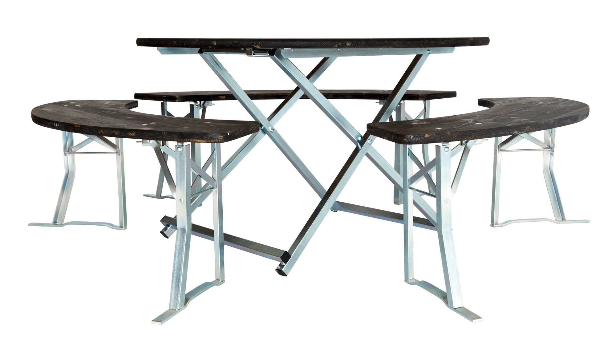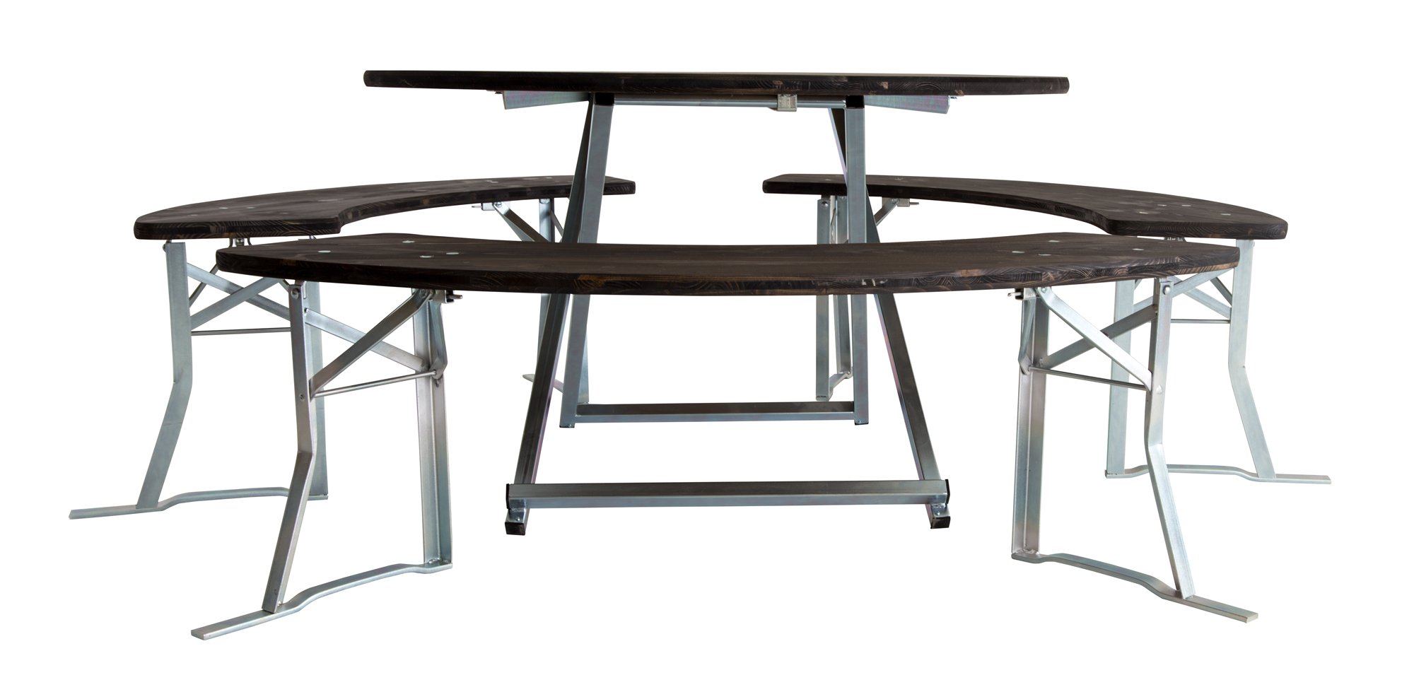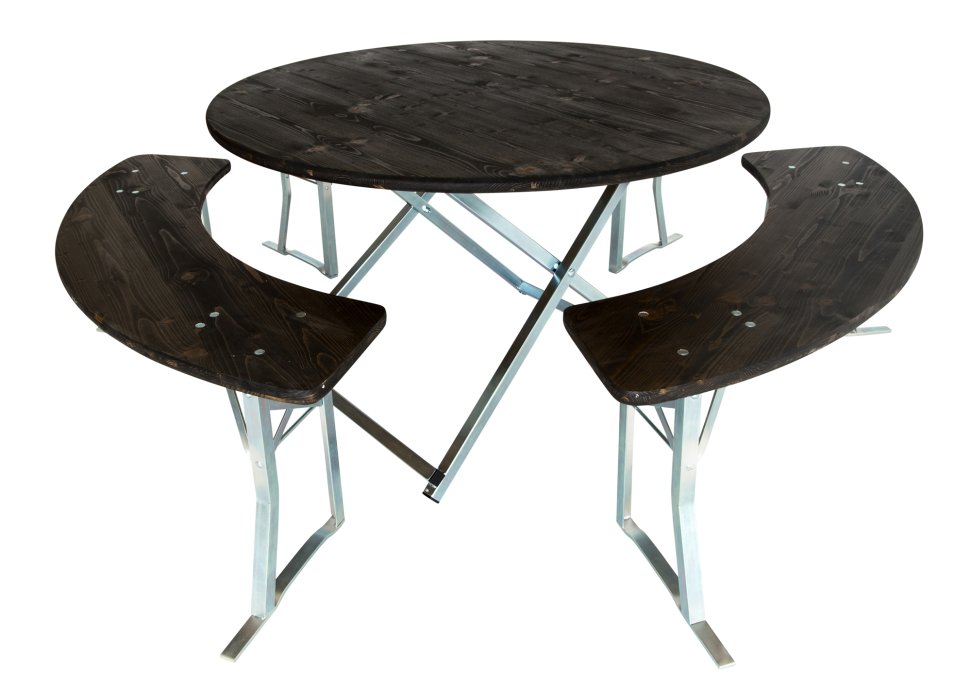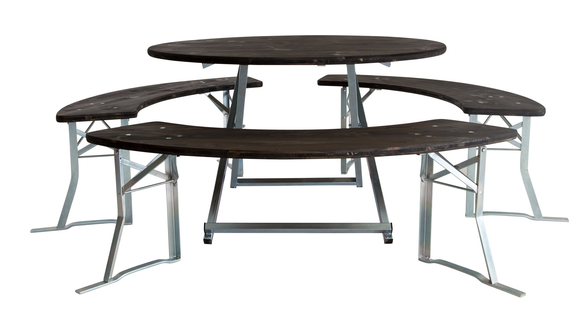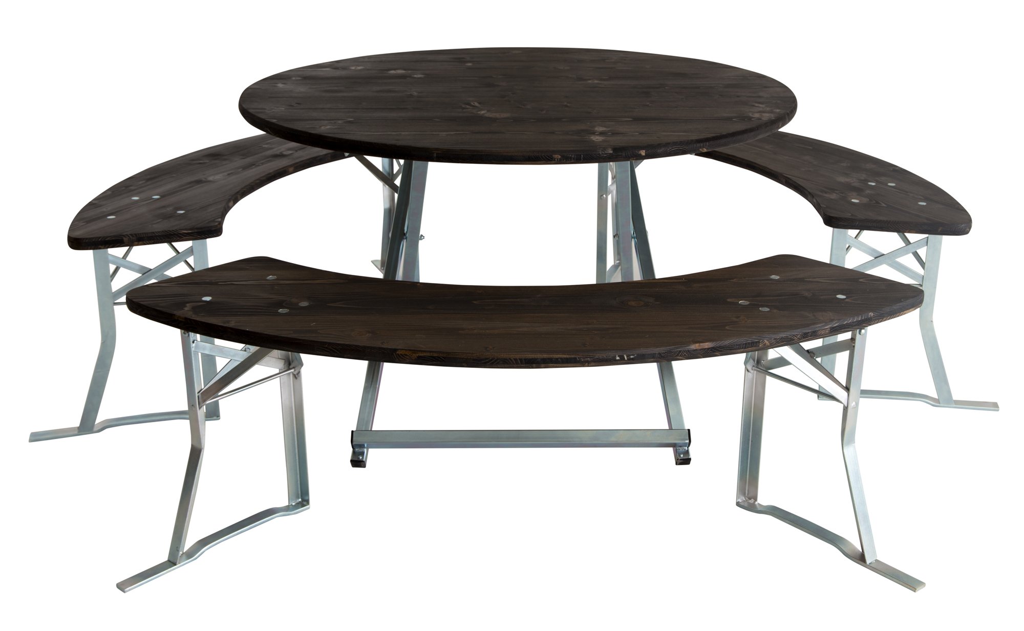 De ronde biertafelset met ronde tafel van 120 cm heeft een tussenruimte van 46 cm wanneer hij wordt opgesteld met drie banken en biedt een zeer comfortabele entree voor uw gasten. De ronde banken van de ronde biertentset model 109 hebben een zitdiepte van 32 cm. Met een lengte van 140 cm is één bank voldoende voor drie gasten. De bovenkanten van de houten planken zijn tweemaal voorzien van een ebbenhouten dunne laag beits en de onderkanten zijn bruin gebeitst. De stabiliteit en het zitcomfort van de ronde banken in vergelijking met standaard brouwerijbanken is aanzienlijk beter door de lange vlakke uitbouw aan de achterkant. Bij gebruik van vier ronde banken is het aantal zitplaatsen ook aanzienlijk hoger met 12 personen per eenheid.
