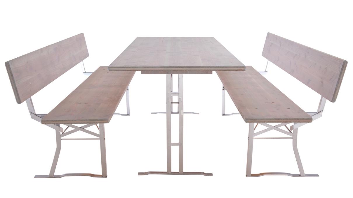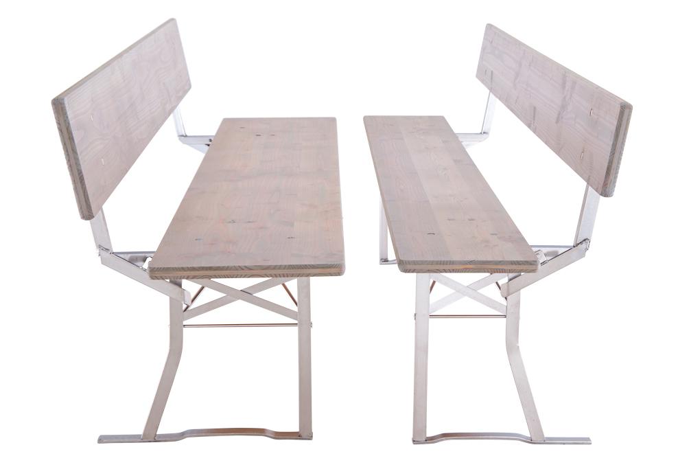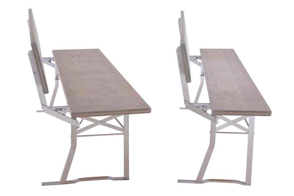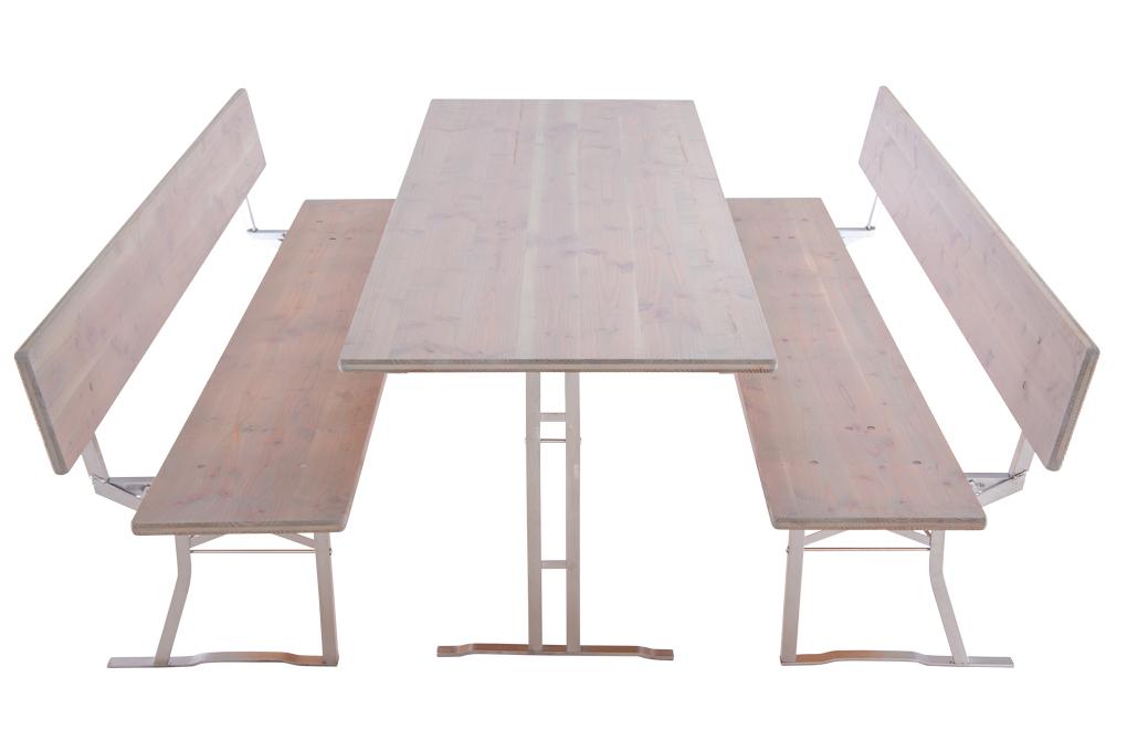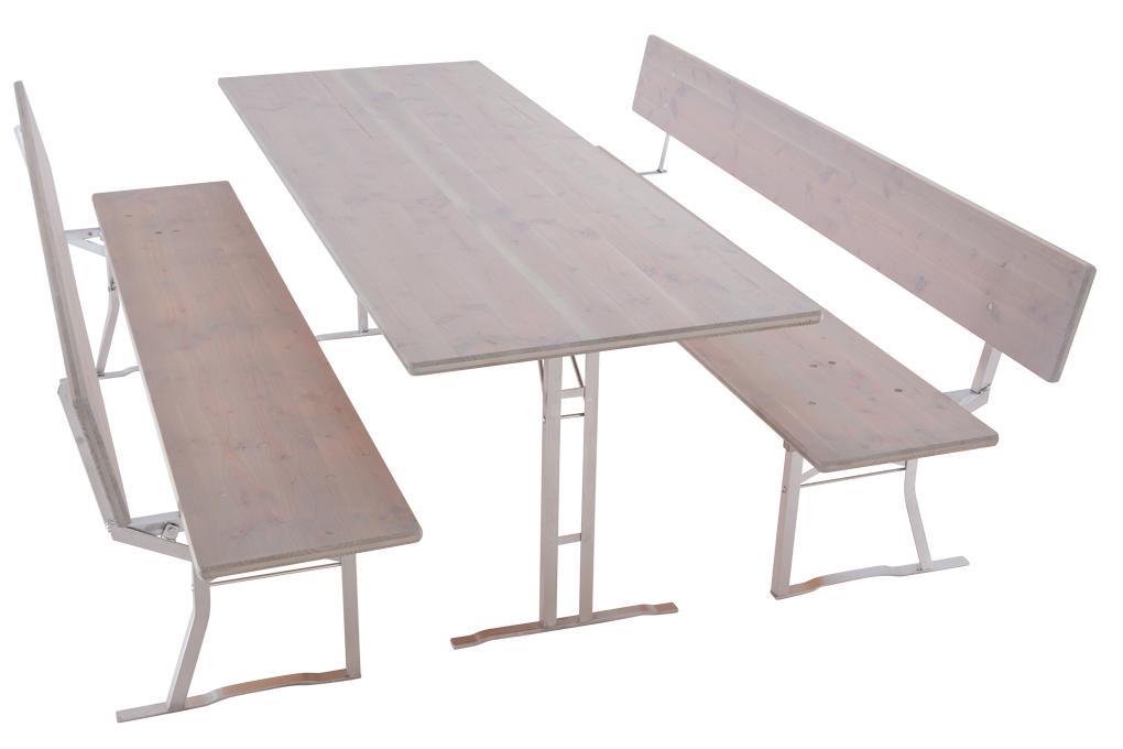 Het bierbankset op de eerste foto is model 311 met 29 cm breed tafelblad. Foto's twee, drie en vier tonen ons biertentstel model 312 met extra brede banken en grotere rugleuning. Het houtoppervlak is geglazuurd met de kleur agaatgrijs, door de roodachtige basiskleur van Douglas hout krijgt het oppervlak van de houten platen een licht roodachtige glans.