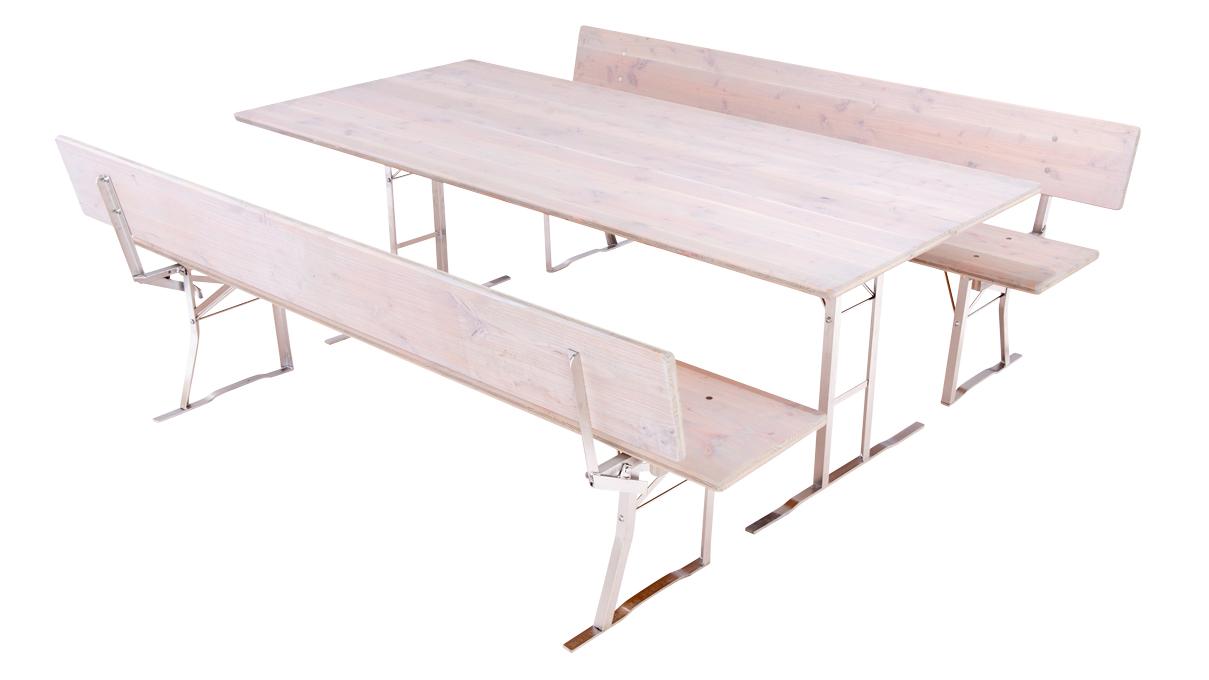 Absoluut weerbestendig gelijmd hout van de houtsoort Douglas, alle doorlopende schroefverbindingen zijn van roestvrij staal, de onderstellen zijn volledig van roestvrij staal V2A en galvanisch gereinigd, met een tafeloppervlak van 2,2 m2 en een totale zitruimte van 1,76 m2 biedt deze biertentenset plaats aan tien personen en heeft aan het hoofdeinde voldoende ruimte om stoelen of korte bierbanken toe te voegen, waardoor het aantal zitplaatsen kan worden verhoogd tot 14 personen.