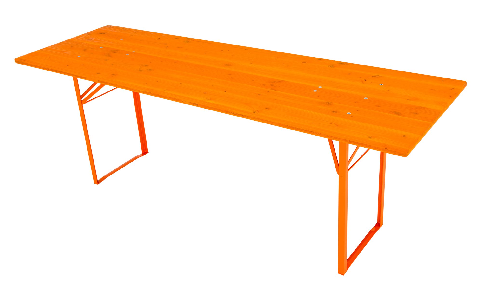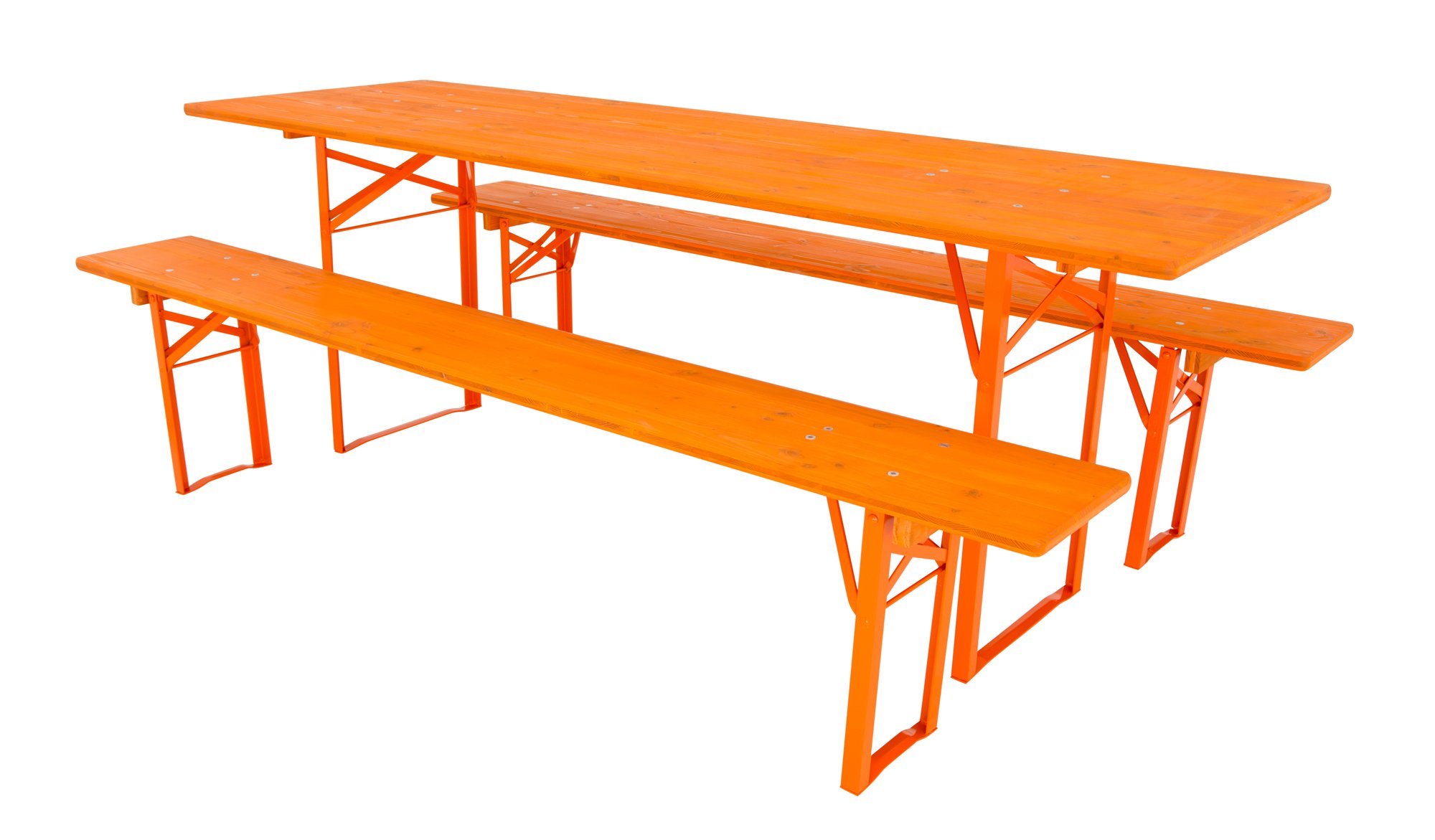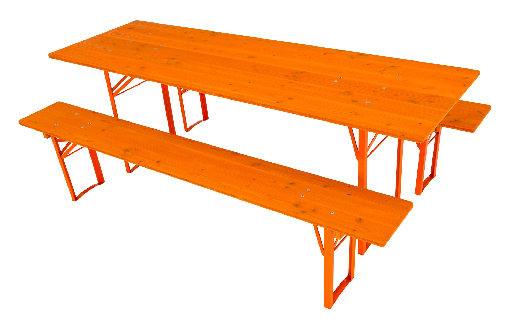 Wij zijn Fabrikant van biertentenset en vervaardigen deze rechthoekig, vierkant en rond in alle maten, kleuren met en zonder rugleuning hier een productievoorbeeld speciale productie in oranje RAL 2009, tafelbreedte 70 cm bankbreedte 27 cm. De houten bovenbladen zijn optioneel verkrijgbaar in vuren of douglasspar. In het hier getoonde productievoorbeeld werden houten planken van Douglasspar gebruikt, die tweemaal werden behandeld met een dun laagje glazuur, geverfd in RAL 2009. Het houtoppervlak van deze glazuren kan worden vergeleken met geolied hout, ze zijn niet ondoorzichtig en de houtstructuur is doorschijnend. De bladen van de biertafel en de bank zijn gemaakt van drielagig Douglas sparren- of vurenhout met drie lagen die kruislings zijn verlijmd. Elke houtlaag heeft een dikte van 9 mm, de bovenste en onderste toplaag hebben een overlangse nerf.