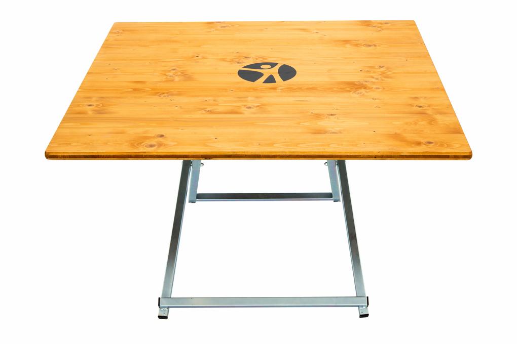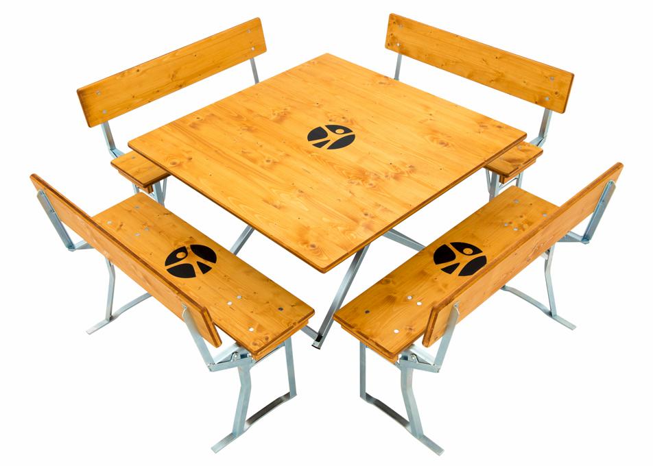 De vierkante tenten set heeft zeefdruk op tafels en banken. Een reclamedrukwerk door zeefdruk is de goedkoopste manier om reclame op houten planken te drukken. Als het scherm eenmaal gemaakt is, kun je er bijna oneindig mee printen. Zodra alles is ingesteld, duurt elke afdruk slechts een paar seconden. Het drukvoorbeeld op de teakhouten biertentset is een zeer eenvoudig motief, zeer ingewikkelde motieven kunnen ook door zeefdruk worden bedrukt.