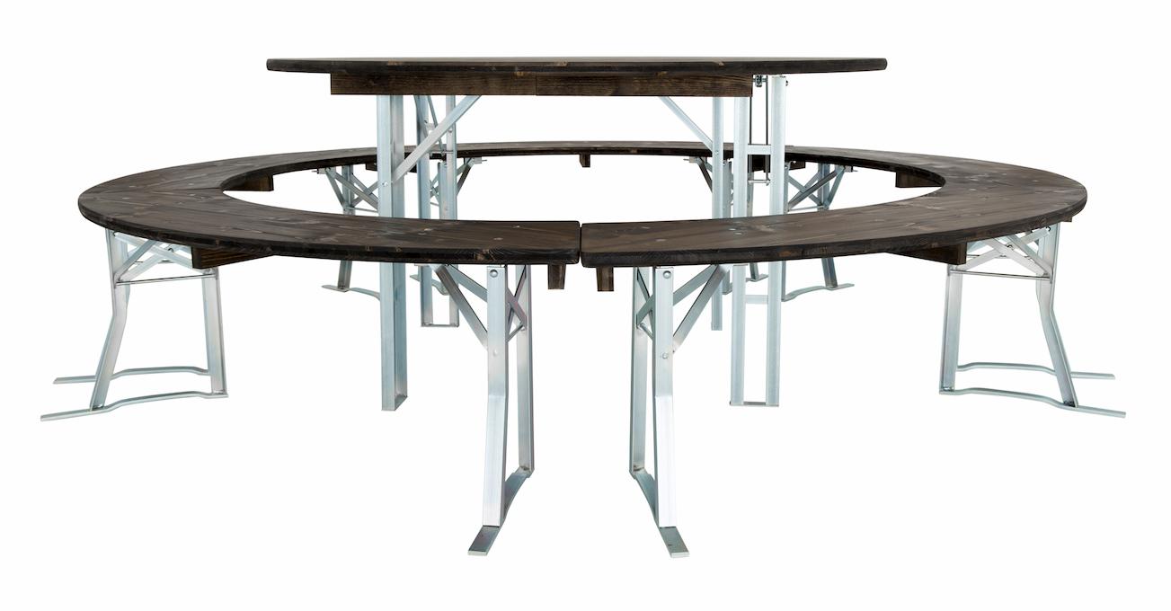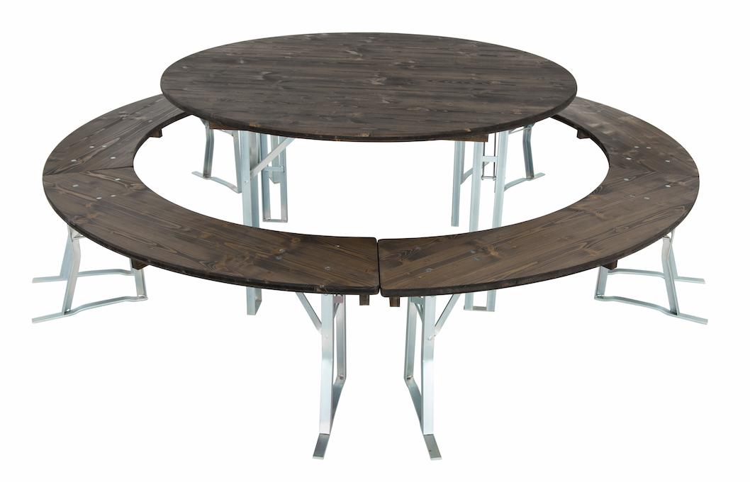 Ronde biertafel set voor maximaal 15 personen en ronde tafel met vier poten. Tafel en banken zijn gemaakt van houten planken met drie lagen, geglazuurd in de houtkleur ebbenhout. De diameter van de tafel is 150 cm. De frames zijn gegalvaniseerd. Echte brouwerijkwaliteit uitstekend voor biertuinen en gastronomie. De ronde biertafelsets met een tafeldiameter van 150 cm zijn verkrijgbaar met een vierpoots universeel tafelonderstel of met een schaartafelonderstel. Beide tafelframes hebben voor- en nadelen. De versie met vier poten kan platter worden geklapt en u kunt de tafel oprollen. Het onderstel van de schaartafel heeft een optimale beenruimte voor de gasten. Als fabrikant hebben wij natuurlijk beide tafelvarianten uitgeprobeerd en wij vinden de variant met het schaarframe de betere.